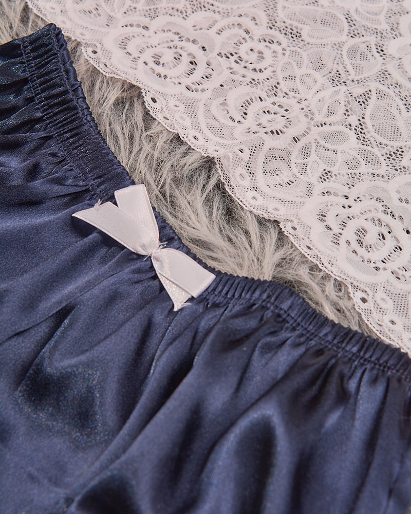 ست لباس خواب تاپ کراپ شلوارک ساتن سرمه ای 1390